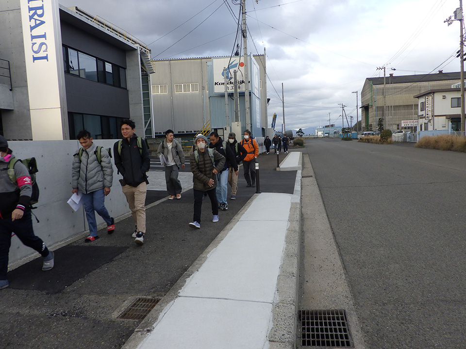 弊社工場から黒島海浜公園展望台まで避難リュックを背負って徒歩で避難訓練を実施。道中に危険個所が無いか確認を行う。(ハザードマップ作成)